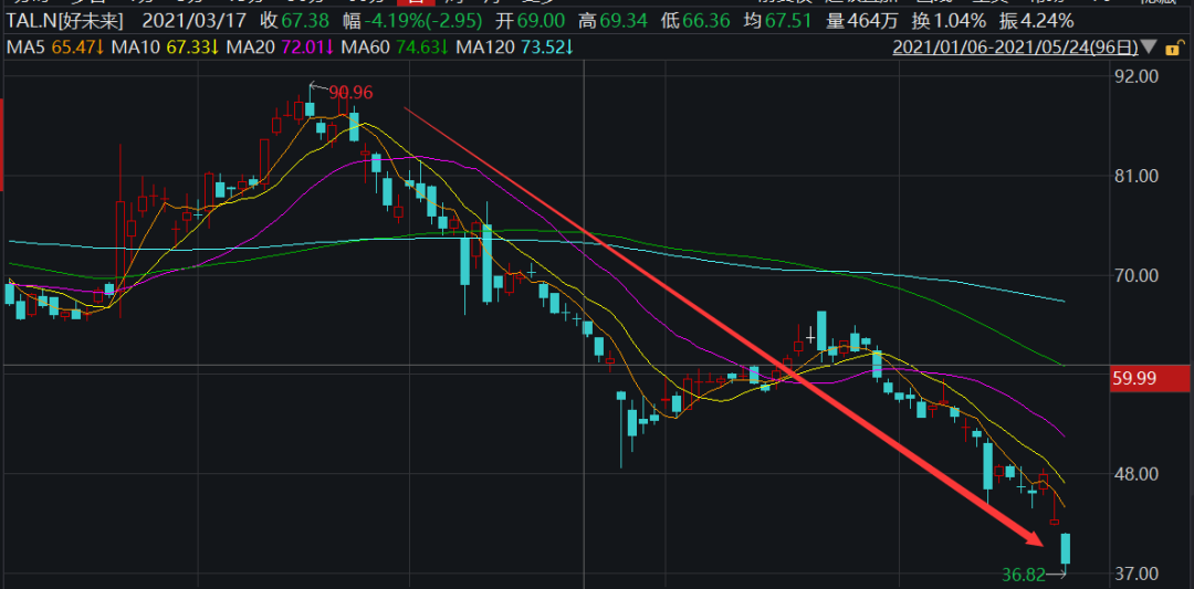 同样的情况也发生在好未来身上,从2月90.96美元的高位,已经下跌60%。