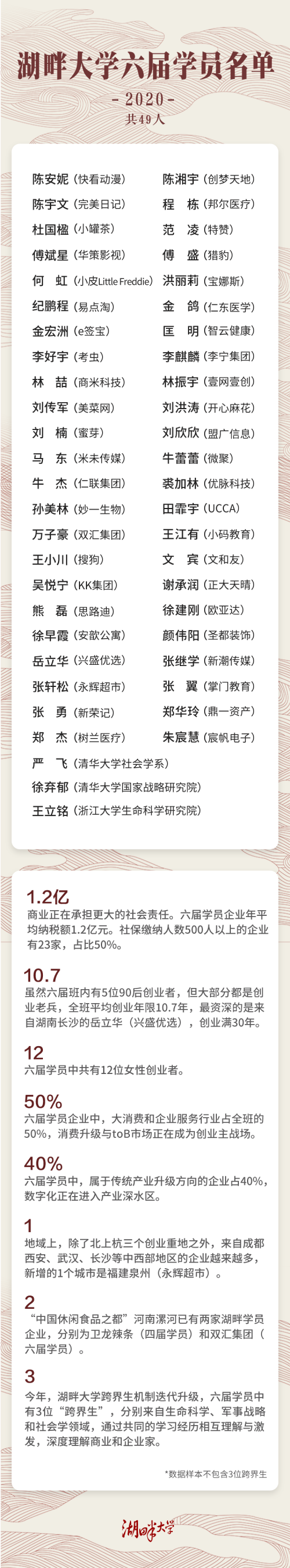 目前,湖畔大学已公布的学员名单只到2020年的第六届。2020年5月25日,湖畔大学公布49人新学员名单。据其介绍,第六届学员企业年平均纳税额1.2亿元,社保缴纳人数500人以上的企业有23家,占比50%。