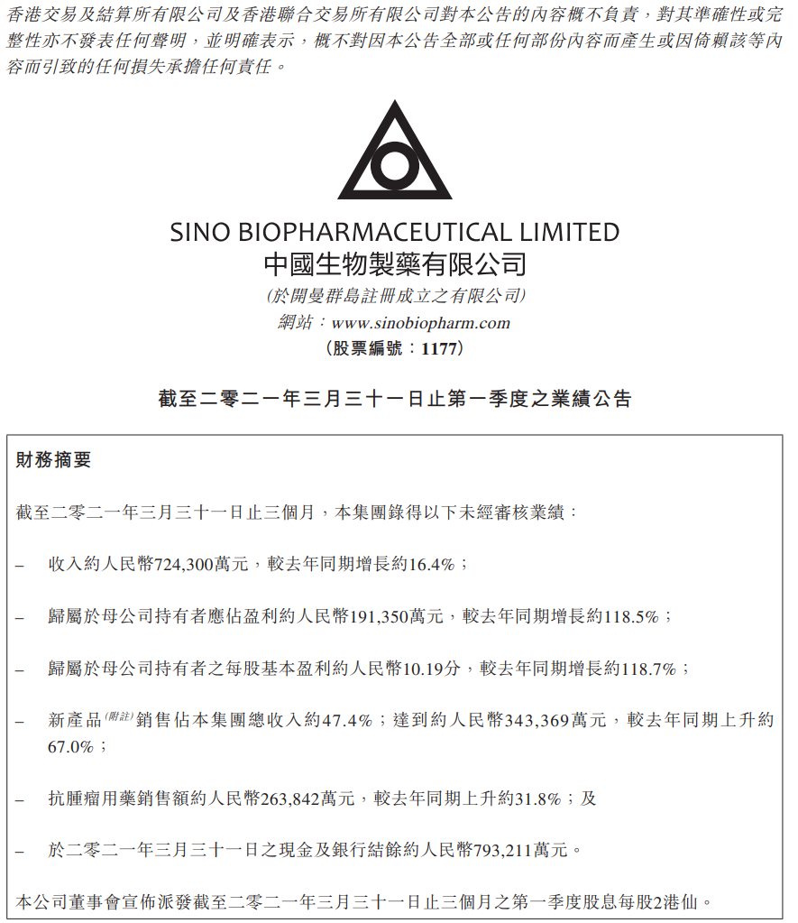 疫苗股的嗨点来自于一家港股上市公司。5月24日,中国生物制药(1177.HK,以下简称:中生制药)公告,截至2021年3月30日止三个月,集团录得收入约人民币72.43亿元,较去年同期增长约16.4%;归属于母公司持有者应占盈利约人民币约19.14亿元,较去年同期增长约118.5%。