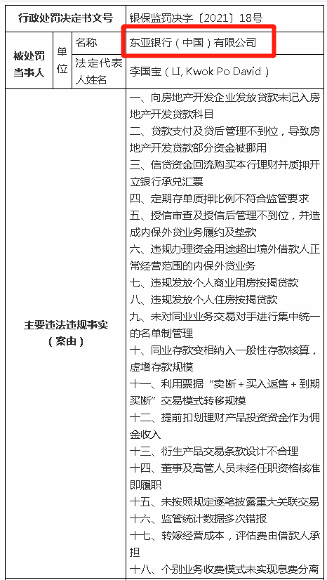 根据银保监会,东亚中国领主要违法违规事实18条,具体如下: