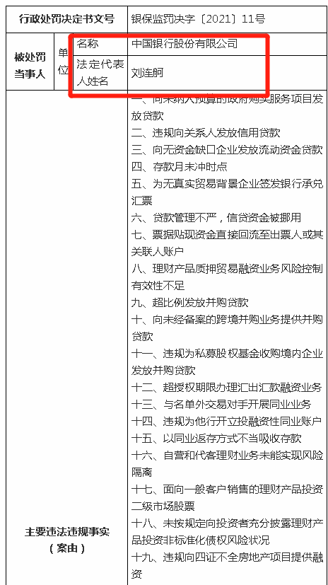 针对中国银行违规发放并购贷款、违规向部分已签约代发工资客户收取年费等多项违法违规行为,依法没收违法所得并处罚款合计8761.355万元,对1名责任人员予以警告处罚。