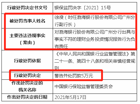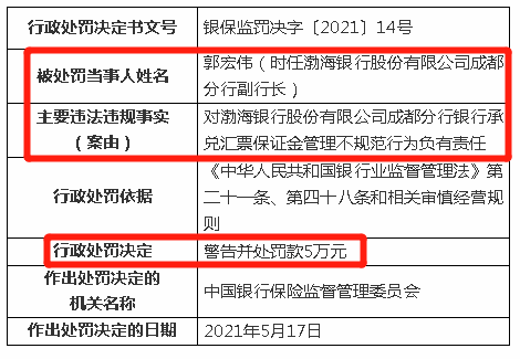 此外,因对渤海银行股份有限公司广州分行出具与事实不符的理财业务投资情况报告行为负有责任,时任渤海银行股份有限公司广州分行副行长徐凌被予以警告并处罚款5万元;因对渤海银行股份有限公司成都分行银行承兑汇票保证金管理不规范行为负有责任,时任渤海银行股份有限公司成都分行副行长郭宏伟被予以警告并处罚款5万元。