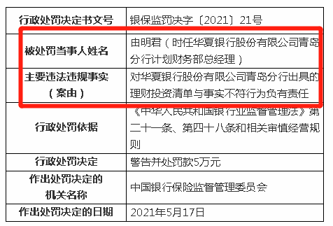 此外,根据处罚决定书信息,时任华夏银行股份有限公司青岛分行计划财务部总经理由明君,由于对华夏银行股份有限公司青岛分行出具的理财投资清单与事实不符行为负有责任,被予以警告并处罚款5万元。时任华夏银行股份有限公司青岛分行行长于丰星则被予以警告处罚。