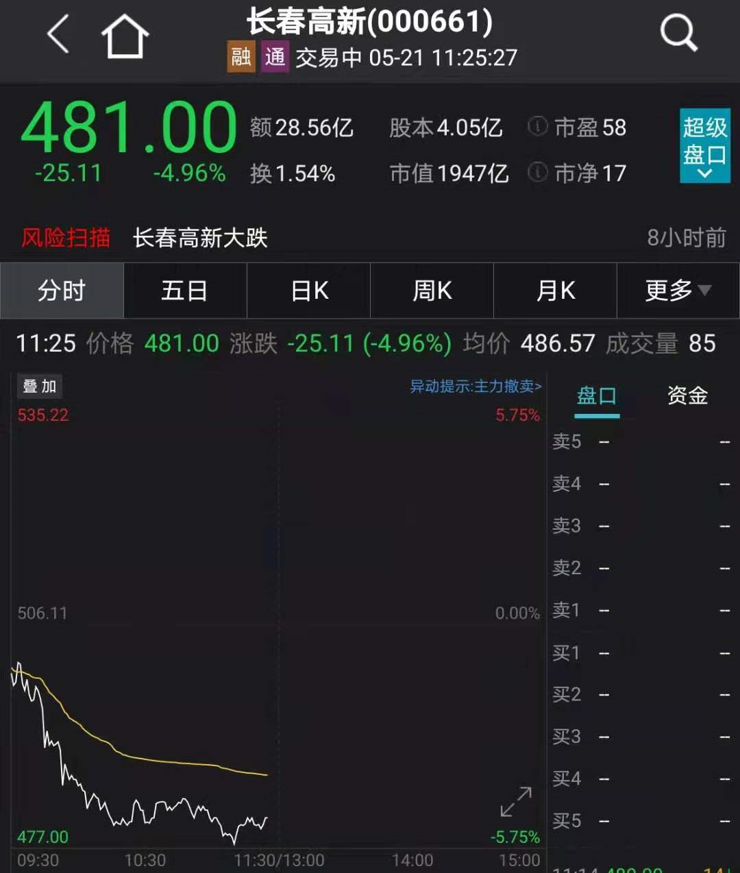 截至午间收盘,长春高新下跌4.96%,总市值报1947亿元,盘中一度下挫近6%。