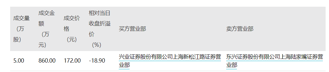 该笔交易的买方营业部为兴业证券股份有限公司上海新松江路证券营业部,卖方营业部为东兴证券股份有限公司上海陆家嘴证券营业部。