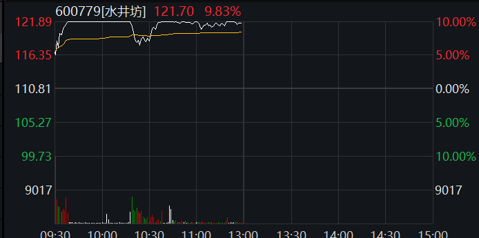 但是截至午间收盘,水井坊三度炸板,白酒板块从上涨4%,收窄至不足2%。
