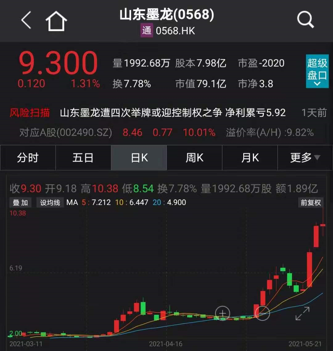 港股山东墨龙(0568.HK)早盘一度高见10.38港元,截至发稿,涨幅收窄至1.31%,报9.3港元,年内累计涨幅高达11倍,暂列港股市场今年涨幅榜第三。