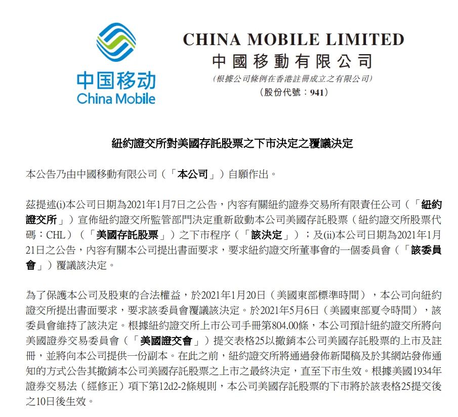 5月7日晚间,三大运营商纷纷公告,纽约证交所委员会维持了纽约证交所监管部门重新启动本公司美国存托证券ADR下市程序的决定,预计纽约证交所将向美国证券交易委员会提交25表格以撤销本公司美国存托证券的上市及注册(退市)。