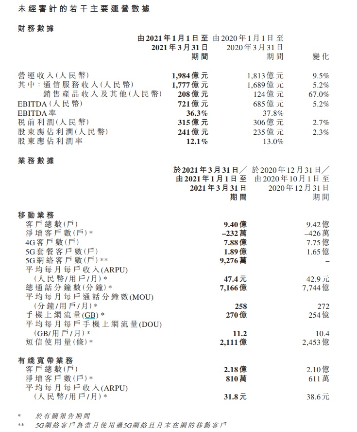 财务数据显示,一季度,中国移动营运收入为1984亿元,比上年同期增长9.5%。其中,通信服务收入为1777亿元,比上年同期上升5.2%。股东应占利润为241亿元,比上年同期上升2.3%。