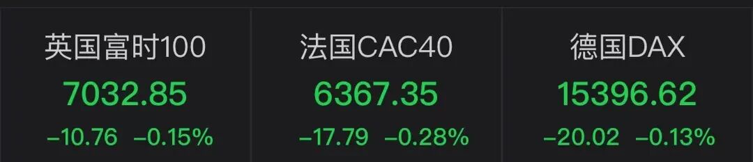 欧股全线收跌, 德国DAX指数跌0.13%,法国CAC40指数跌0.28%,英国富时100指数跌0.15%。