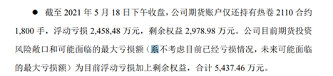 5月19日晚间,金麒麟更新公告称,公司期货账户还持有热卷2110合约1800手,浮动亏损2458.48万元,剩余权益2978.98万元。公司目前期货投资风险敞口和可能面临的最大亏损额(系不考虑目前已经亏损情况,未来可能面临的最大亏损额)为目前浮动亏损加上剩余权益,合计5437.46万元。图片来源:金麒麟公告