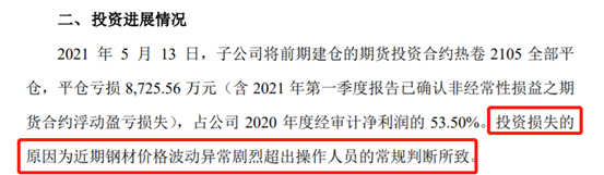 就在三天前,5月16日晚间,金麒麟发布公告称,从今年5月开始至5月13日期间,子公司投资热卷期货合计交易损失8725.56万元,占公司2020年度经审计净利润的53.50%。