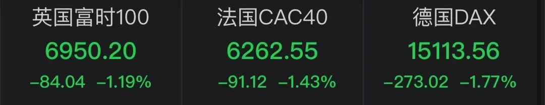 欧洲三大股指均收跌逾1%。 德国DAX指数跌1.77%,法国CAC40指数跌1.43%,英国富时100指数跌1.19%。