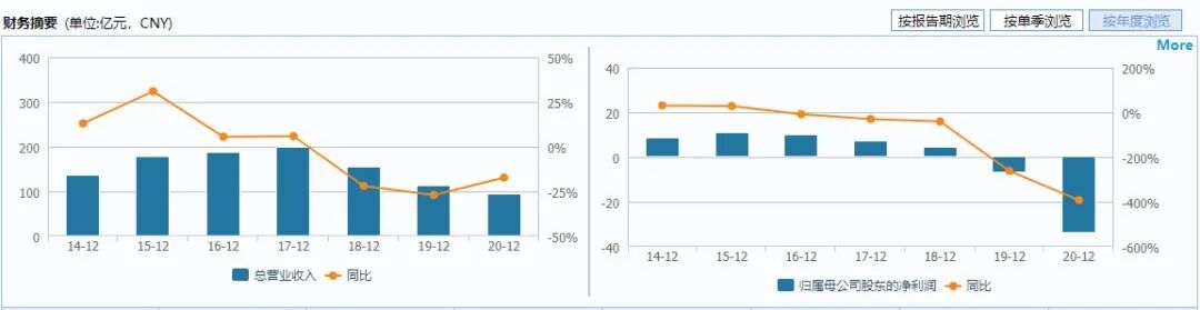 Wind统计显示,上市后的金正大,曾实现了收入“7连增”并于2017年,达到营收峰值198.33亿元,净利润7.15亿元,随后营收一路下滑。2020年,金正大净亏损33.66亿元,为公司自上市以来最大规模的亏损。来源:Wind