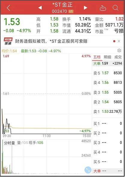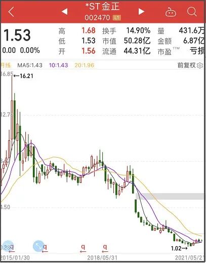 股价上,金正大股价已经缩水超过九成,截至5月21日收盘,*ST金正报1.53元,最新市值50.3亿元,较2021年年初下挫超过40%,较2015年高点暴跌近90%。来源:同花顺