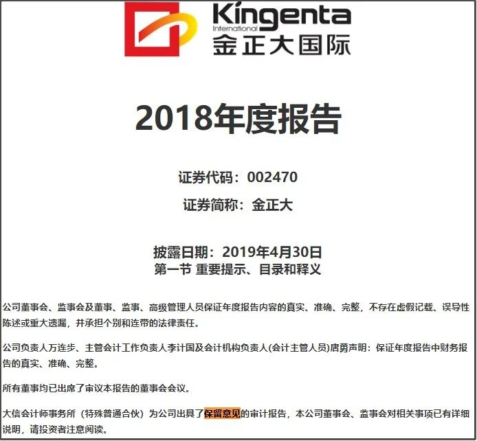早在2019年,金正大已露出了财务造假的端倪,2019年4月披露的金正大《2018年年报》,被审计机构出具了保留意见。