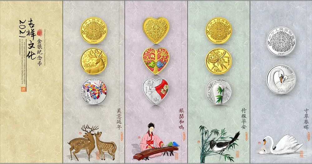 中国人民银行自2021年5月9日起发行2021吉祥文化金银纪念币一套。该套金银纪念币共7枚,其中金质纪念币3枚,银质纪念币4枚,均为中华人民共和国法定货币。