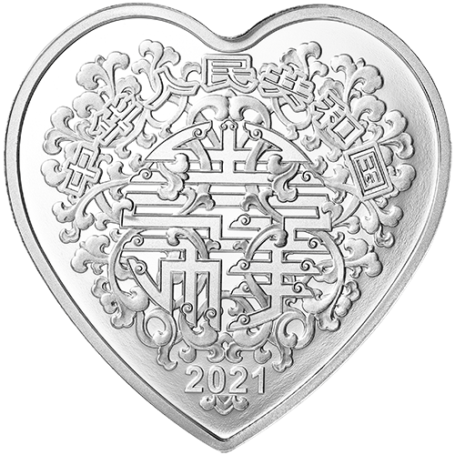 30克心形银质“琴瑟和鸣”纪念币正面图案为“吉祥”文字造型衬以中国传统纹饰,并刊国名、年号。