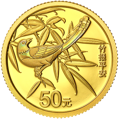 3克圆形金质“竹报平安”纪念币背面图案为喜鹊与竹子枝叶组合图案,并刊“竹报平安”字样及面额。