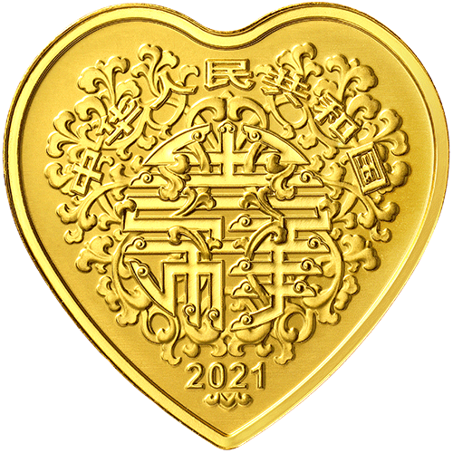 3克心形金质纪念币为精制币,含纯金3克,外接正方形边长18毫米,面额50元,成色99.9%,最大发行量20000枚。