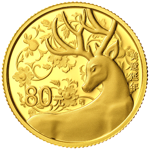 5克圆形金质“美意延年”纪念币背面图案为鹿、寿桃、吉祥花卉等组合图案,并刊“美意延年”字样及面额。