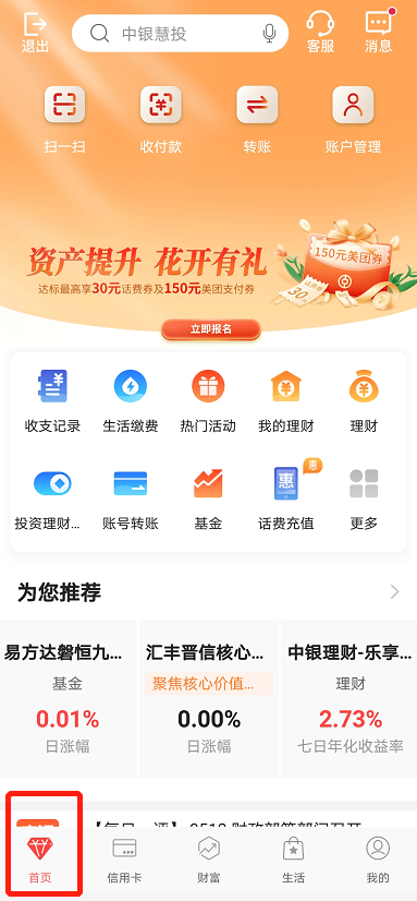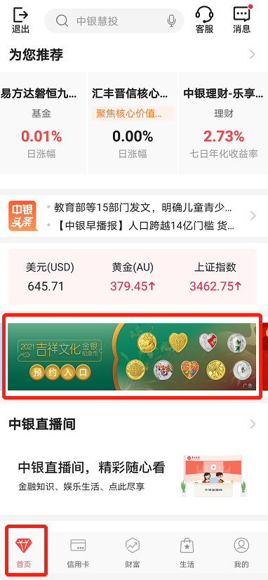 登录中国银行APP,进入 “首页” ,下滑至 “轮播广告” 点击进入即可预约。