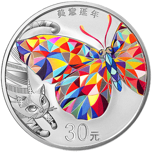 100克圆形银质“美意延年”纪念币背面图案为蝴蝶与猫组合图案,并刊“美意延年”字样及面额。