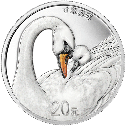 60克圆形银质“寸草春晖”纪念币背面图案为母子天鹅造型,并刊“寸草春晖”字样及面额。