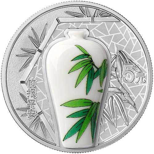 15克圆形银质“竹报平安”纪念币背面图案为梅瓶、竹子枝叶、窗等组合图案,并刊“竹报平安”字样及面额。