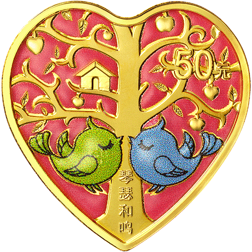 3克心形金质“琴瑟和鸣”纪念币背面图案为两只小鸟、树、果实等组合图案,并刊“琴瑟和鸣”字样及面额。