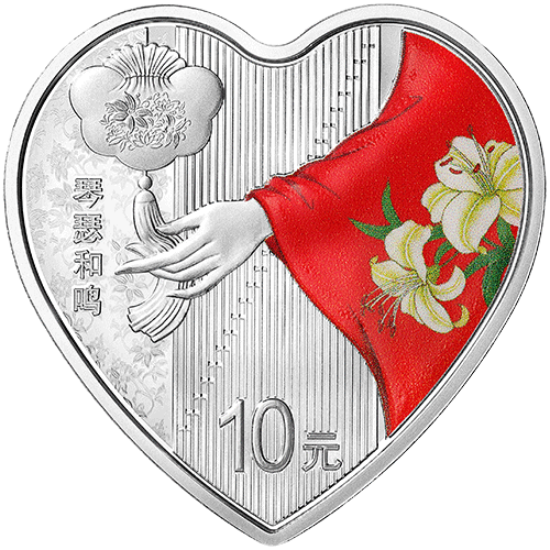30克心形银质“琴瑟和鸣”纪念币背面图案为百合花装饰衣袖、女子手、香囊、瑟等组合图案,并刊“琴瑟和鸣”字样及面额。