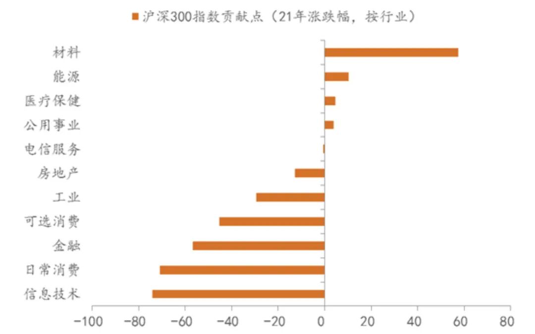 年初以来大类行业表现来看,无论是A股还是全球,都是能源和材料板块领涨,但A股涨幅比MSCI全球指数要弱一些。另一个主要的落差在金融指数,全球金融指数都暴涨,唯独A股是下跌的,这还是建立在A股银行指数今年有9%以上的涨幅基础上,显然,拖后腿的是券商和保险。此外,消费和信息技术因为抱团去年太猛,今年回调幅度较大,我们的工业指数军工权重较高,所以也表现不好,这几个板块是今年沪深300指数点位变化的贡献度里面,最靠后的。
