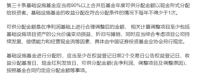 值得注意的是,中国证监会在2020年8月7日发布的《公开募集基础设施证券投资基金指引(试行)》中,对基础设施公募REITs提出了明确的分红规定,其收益分配应该在符合分配条件的情况下 每年不得少于1次 。
