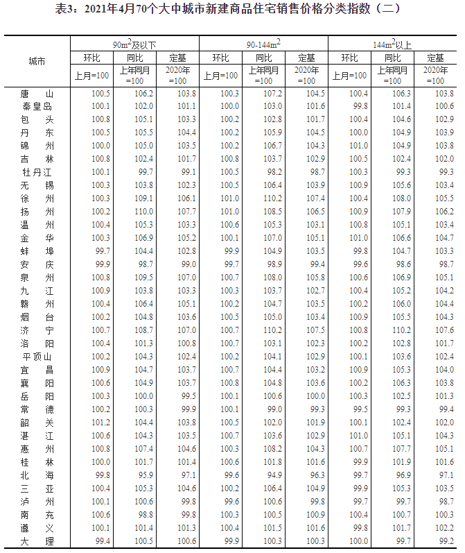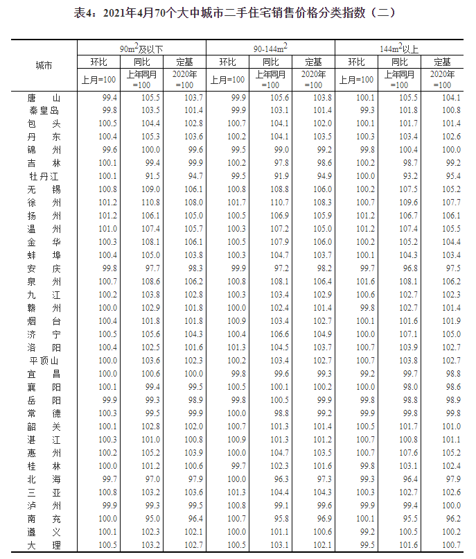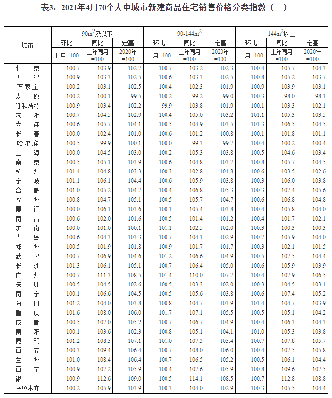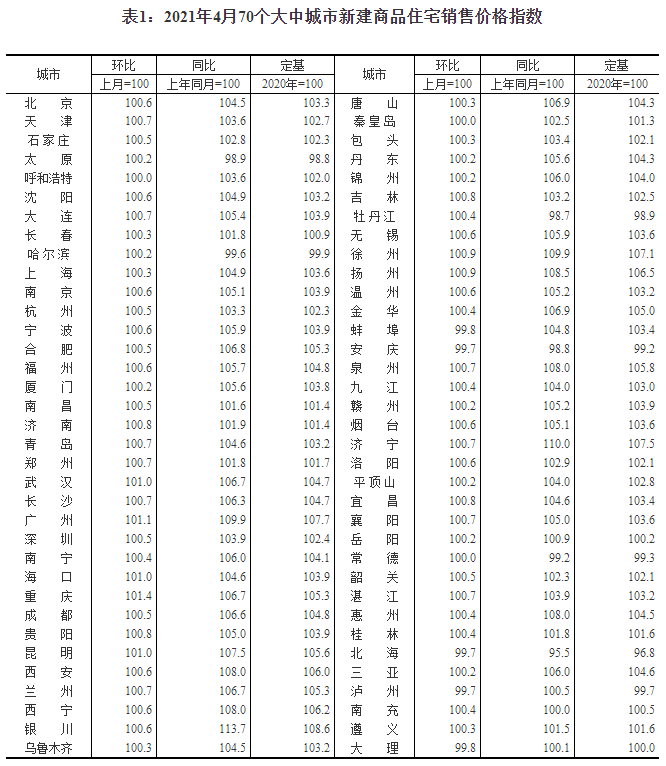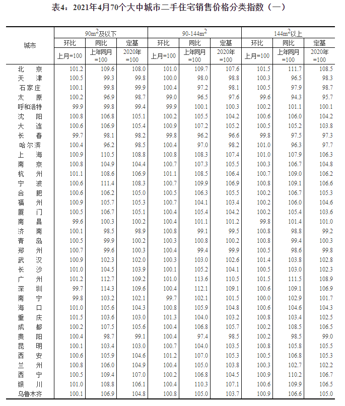 刚刚,国家统计局公布2021年4月份70个大中城市商品住宅销售价格变动情况。