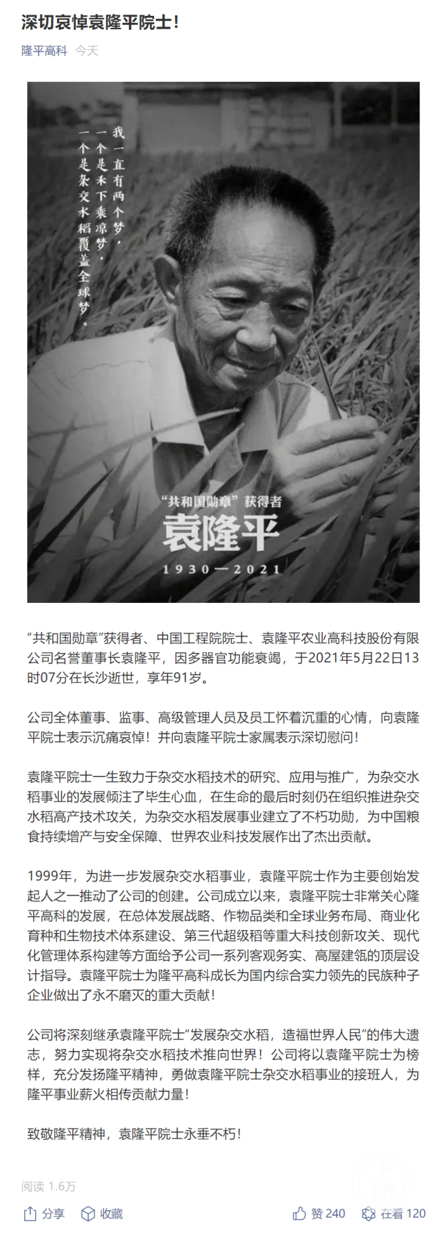 A股上市公司隆平高科22日发文:“共和国勋章”获得者、中国工程院院士、袁隆平农业高科技股份有限公司名誉董事长袁隆平,因多器官功能衰竭,于2021年5月22日13时07分在长沙逝世,享年91岁。