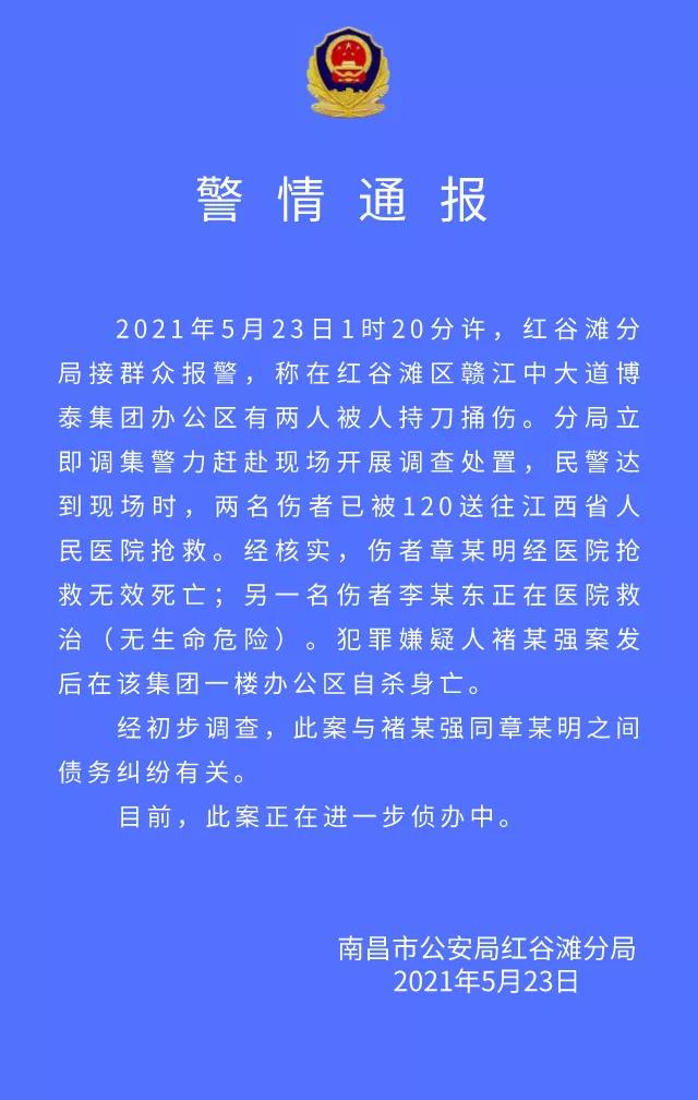 警情通报显示,2021年5月21日1时20分许,红谷滩分局接群众报警,称在红谷滩区赣江中大道博泰集团办公区有两人被人持刀捅伤。分局立即调集警力赶赴现场开展调查处置。民警达到现场时,两名伤者已被120送往江西省人民医院抢救。经核实,伤者章某明经医院抢救无效死亡;另一名伤者李某东正在医院救治(无生命危险)。犯罪嫌疑人褚某强案发后在该集团一楼办公区自杀身亡。