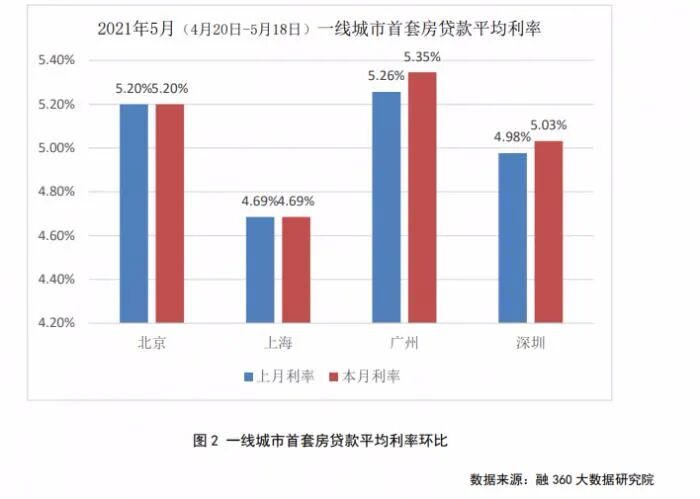 5月19日,融360大数据研究院对全国42个重点城市房贷利率的监测数据显示,2021年5月(数据采集期为2021年4月20日-2021年5月18日),全国首套房贷款平均利率为 5.33%,环比上涨 2BP;二套房贷款平均利率为5.61%,环比上涨2BP。