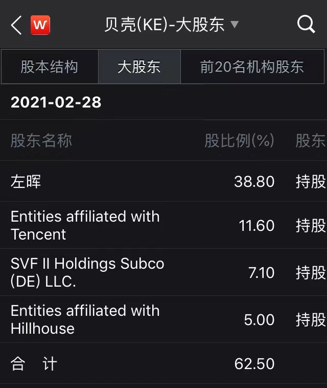 股东结构方面,据最新披露,链家创始人左晖个人持股38.8%,为贝壳第一大股东;腾讯为贝壳第二大股东,持股11.6%;此外,软银愿景基金持股7.1%。