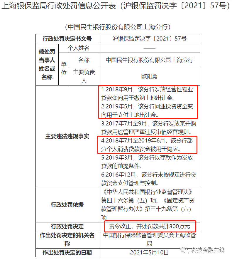 具体来看,民生银行上海分行因“六宗罪”被罚款300万,其中在楼市方面违规的情形包括:经营性物业贷款被变向用于缴纳土地出让金、同业投资资金被变向用于支付土地出让金、部分个人消费贷款资金被用于购房。