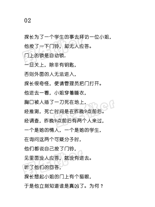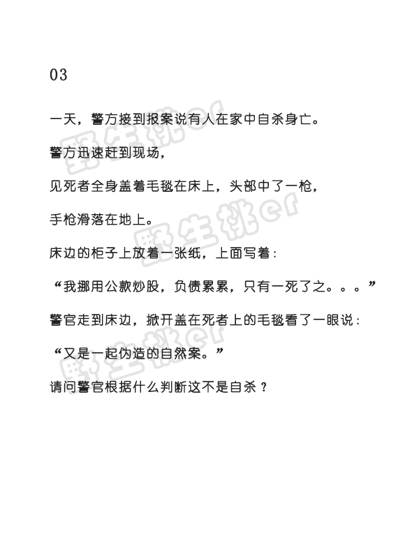 长按二维码,订阅 【野生桃er】 发送关键词 【 侦探 】 即可获得推理小故事全讲解!