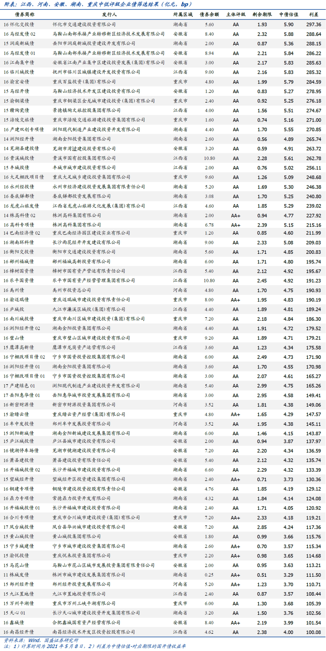 具体个券推荐上,建议参考《如何利用企业债的“保护效应”择券》一文中的思路,考虑到企业债里有近76%属于城投,且大部分属于中低等级主体,历史数据也表明企业债对中低等级主体更加具有保护效应。我们重点筛选以上几个区域城投的中低等级主体企业债,筛选标准包括:1)外部评级为AA+或AA,且利差为处于100-300bp之间;2)行权剩余期限处于0.5-3年之间。具体筛选结果见附表,供投资者参考。