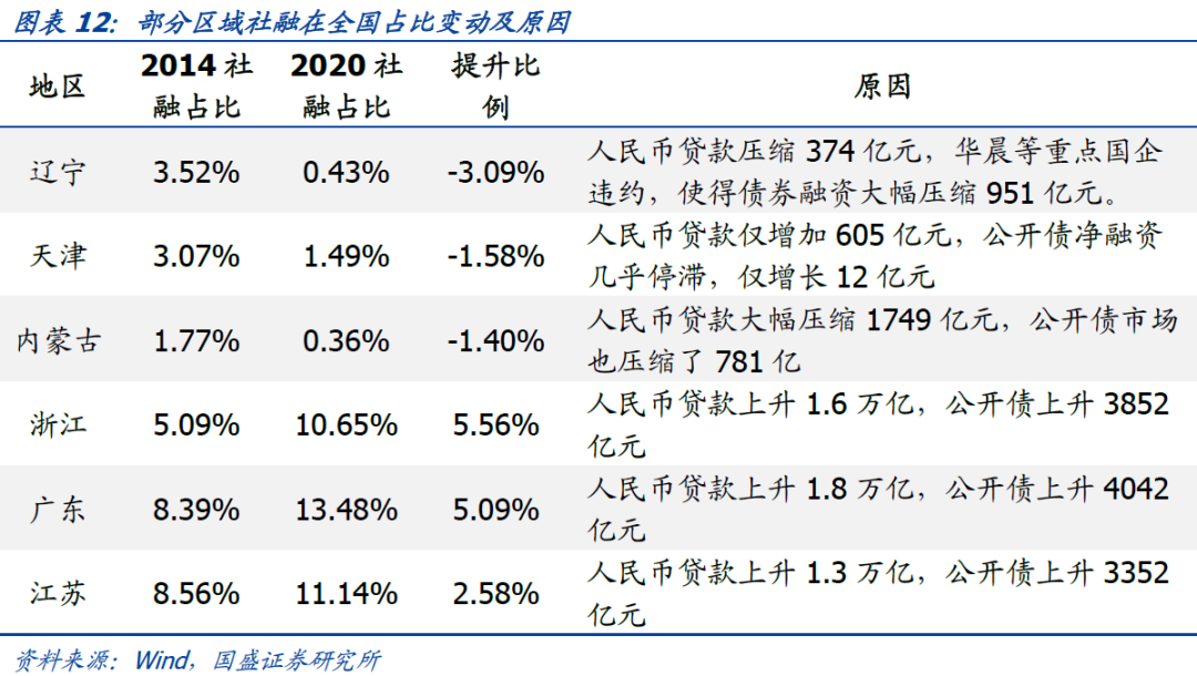 天津、辽宁、内蒙等区域社融占比持续压缩,广东、浙江、江苏等区域社融占比持续提升。 对于社融占比大幅下降的省份而言,除了资管新规导致委托贷款、信托贷款与汇票压缩之外, 更主要的原因在于人民币贷款压缩或增长缓慢,以及地区负面事件频出导致信用债融资恶化,出现信用债“雨天收伞”的局面。 例如:1)2014-2020年期间辽宁省社融压缩约4216亿元,其人民币贷款压缩约374亿元,华晨等重点国企的违约,使得辽宁省债券融资更是压缩951亿至-58亿元,这导致辽宁省2020年社融在全国占比仅为0.43%,与2014年相比下降3.09个百分点。2)2014-2020期间天津市社融压缩311亿元,占全国比例从2014年的3.07%下降至2020年的1.49%。在此期间天津市人民币贷款仅增长605亿元,公开债市场净融资则几乎停滞,仅增长12亿元。3)2014-2020期间内蒙古社融压缩1679亿元,其中人民币贷款大幅压缩1749亿元,公开债市场也压缩了781亿元。导致内蒙古社融占比从2014年的1.77%下降至0.36%。 资管新规导致全国各区域非标均出现压缩,但部分省份人民币贷款巨额放量,公开债市场也随之繁荣,出现了信用债“晴天送伞”的局面,导致社融占全国比例大幅提升, 例如与2014年相比, 浙江 、 广东 、 江苏 占比分别提升5.56、5.09和2.58个百分点至10.65%、13.48%和11.14%,在此期间三个省份人民币贷款分别上升1.6万亿、1.8万亿和1.3万亿,公开债市场分别上升3852亿元、4042亿元和3352亿元。