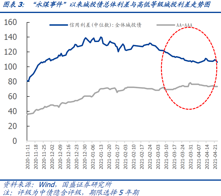 4.1三月底以来政策开始调整,注重防控债市风险 4 月末召开的政治局会议表述对信用风险变化有深远的影响。 4月末政治局会议明确要求建立地方党政主要领导负责的财政金融风险处置机制。一季度货币政策执行报告进一步明确对重大金融风险严肃追责问题,有效防范道德风险。这意味着与此前在地方主要由金融办或者副省长主导的金融协调会议负责财政金融风险防范不同,以后财政金融风险处置机制则主要由书记和省长等一把手负责, 这一方面会明显提升相关处置机制的资源协调能力,另一方面也压实了相关责任,不会再出现相关金融风险无人负责的情况。 三月底以来,政府文件及动作愈加频繁。 国务院国资委印发《关于加强地方国有企业债务风险管控工作的指导意见》,中共中央政治局会议提出财政金融风险处置机制;山西、河南、天津等弱区域政府积极出面做出回应及协调。都显示了中央及地方从自上而下角度不断完善市场和积极引导信用市场预期的态度。 一方面来自各地政府,维稳地方信用市场的消息接连传出,增强市场信心;一方面来自中央监管层面,不断规范市场环境,出台相关管控意见。 我们认为政策态度的呵护,将有助于中等偏弱区域城投的信用资质修复,有助于带来区域间城投抱团的“瓦解”。