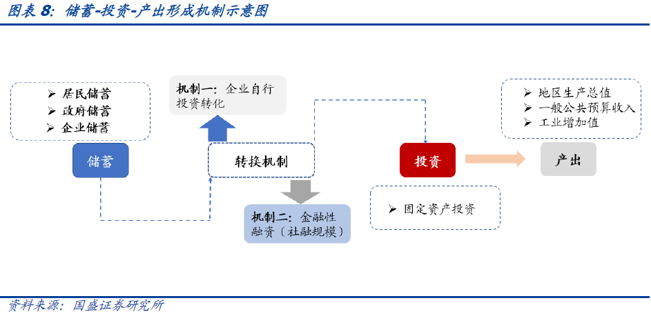 我们构建了地区经济的储蓄-投资-产出评价模型,以考察不同区域资本对经济的推动作用。 资本首先通过储蓄形成供给,再通过一定的转化机制形成投资,并最终获得产出。具体来看: 1)储蓄 包括居民储蓄、政府储蓄以及企业储蓄,其中居民储蓄用银行存款衡量,政府储蓄一般为负,所以我们选用政府财力表征指标,用税收收入表示,企业储蓄用企业盈余利润衡量; 2)转换机制 主要包括企业自行投资转化,以及金融性融资,其中金融性融资可以通过社会融资规模来衡量; 3)投资 主要选取固定资产投资这一指标进行衡量; 4)产出 衡量指标包括地区生产总值、一般公共预算收入、工业增加值这三大指标。