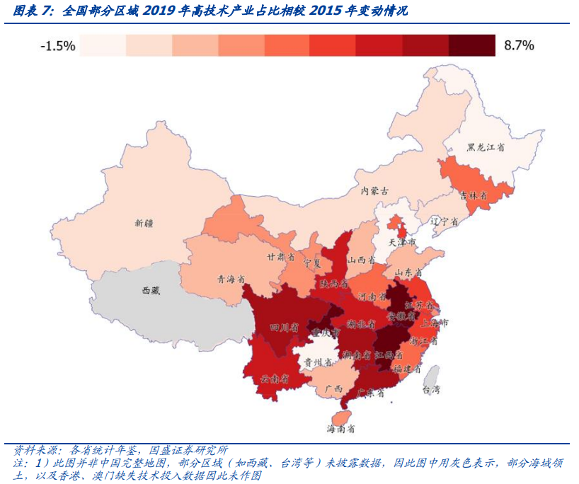 一般认为,技术投入的变动是一种慢变量,因此传统的增长理论(如索罗模型)一直将其作为外生变量来看待。 但我们统计各地区2015至2019年高技术产业占比的变动情况,发现各区域呈现明显的“马太效应”。 东南、中西部地区在2015年时高技术产业占比就已具备领先优势,但从2015-2019年的边际变动情况看,这些区域在这4年时间里技术投入增长也更快,从而导致2019年时领先优势进一步放大,不同区域技术要素投入出现了明显的“马太效应”。例如广东省在2015年时高技术产业占比就已高达28.2%,4年期间又进一步上升5.5%,增速排全国第4。贵州省2015年时高技术产业占比为6.7%,2019年进一步下滑至5.2%。 江西、安徽增长则表现亮眼,成为少数“黑马”。 2015年安徽省(7%)和江西省(7.8%)高技术占比均不高,但2015-2019年期间高技术占比分别上升了7.3%和8.7%,增速位列前四,从而在2019年时占比均处于10%以上的中高等级行列。