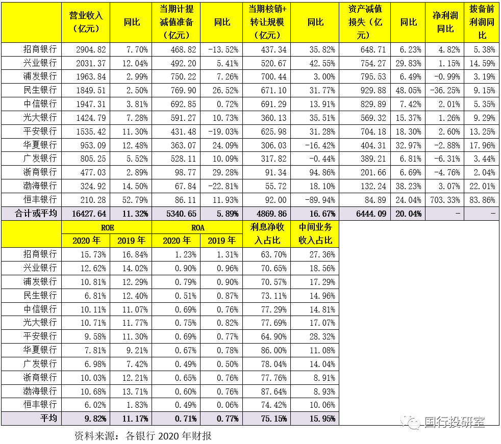 营业收入可进一步分为利差收入、中间业务收入和投资收益等几个部分,目前12家股份行的利差收入占比平均为75%左右,中间业务收入占比平均为16%。其中,中间业务收入占比较高的银行主要有平安银行(28.32%)、招商银行(27.36%)、兴业银行(18.56%)。### 3、招行和兴业银行的ROE较高,恒丰、民生、广发与华夏等银行较低