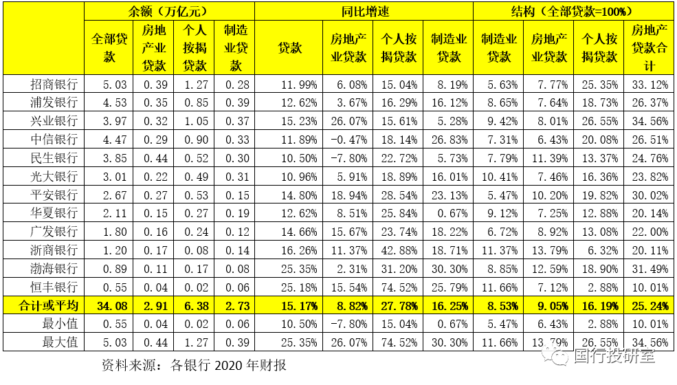 活期存款占比是一家银行真正的竞争力所在,招行在这方面优势尤其明显。12家股份行的零售活期存款占比、公司活期存款占比平均分别为33.21%和46.13%。其中零售活期存款占比较高的银行主要有招行(68.90%)、兴业银行(44.68%)、华夏银行(37.98%)、平安银行(35.38%)、中信银行(34.86%)和光大银行(34.59%),公司活期存款占比较高的银行主要有招行(64.14%)、华夏银行(53.95%)、中信银行(53.35%)、浦发银行(51.57%)。### 5、制造业贷款与房地产业贷款占比平均分别为8.53%和25.24%