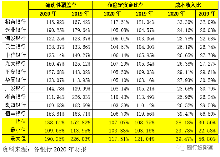 1、2020年,12家股份行的流动性覆盖率、净稳定资金比例平均分别为138.61%和107.07%,整体上看较2019年有一定下降。2、2020年,12家股份行的成本收入比为28.18%,较2019年下降2.32个百分点,成本收入比较低的银行主要有浦发银行(23.78%)、兴业银行(24.16%)和浙商银行(25.96%),较高的银行主要有恒丰银行(39.47%)、招行(33.30%)、平安银行(29.11%)。