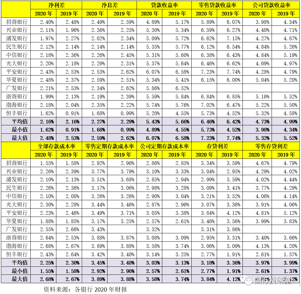 2020年,12家股份行的净利差与净息差平均值分别为2.16%和2.27%,整体上在各类型银行中还是处于高位。整体存贷利差与零售存贷利差的平均值分别为3.18%和3.97%,其中整体存贷利差较高的银行主要有平安银行(3.84%)、华夏银行(3.46%)、招行(3.34%)、广发银行(3.31%),零售存贷利差较高的银行主要有平安银行(4.81%)、招行(4.67%)、兴业银行(4.29%)、渤海银行(4.13%)和浦发银行(4.02%)。### 2、零售贷款与公司贷款收益率平均分别为6.46%和4.73%
