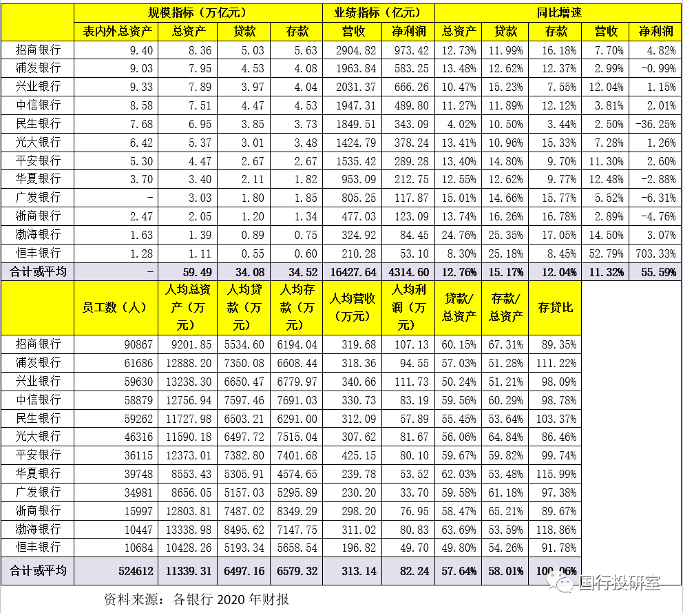 12家股份行共拥有52.46万名员工,总资产、贷款与存款合计分别为59.49万亿、34.08万亿、34.52万亿,合计实现16248亿元营收和4315亿元净利润。 (一)规模与人均指标